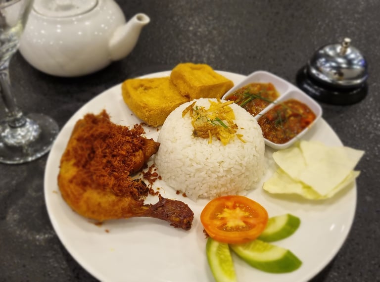 Ayam Goreng dengan bumbu khas Three Little Dragons, Berpadu dengan Serundeng laos dengan 2 sambal favorit yaitu, Sambal Terasi dan Sambal Bawang.